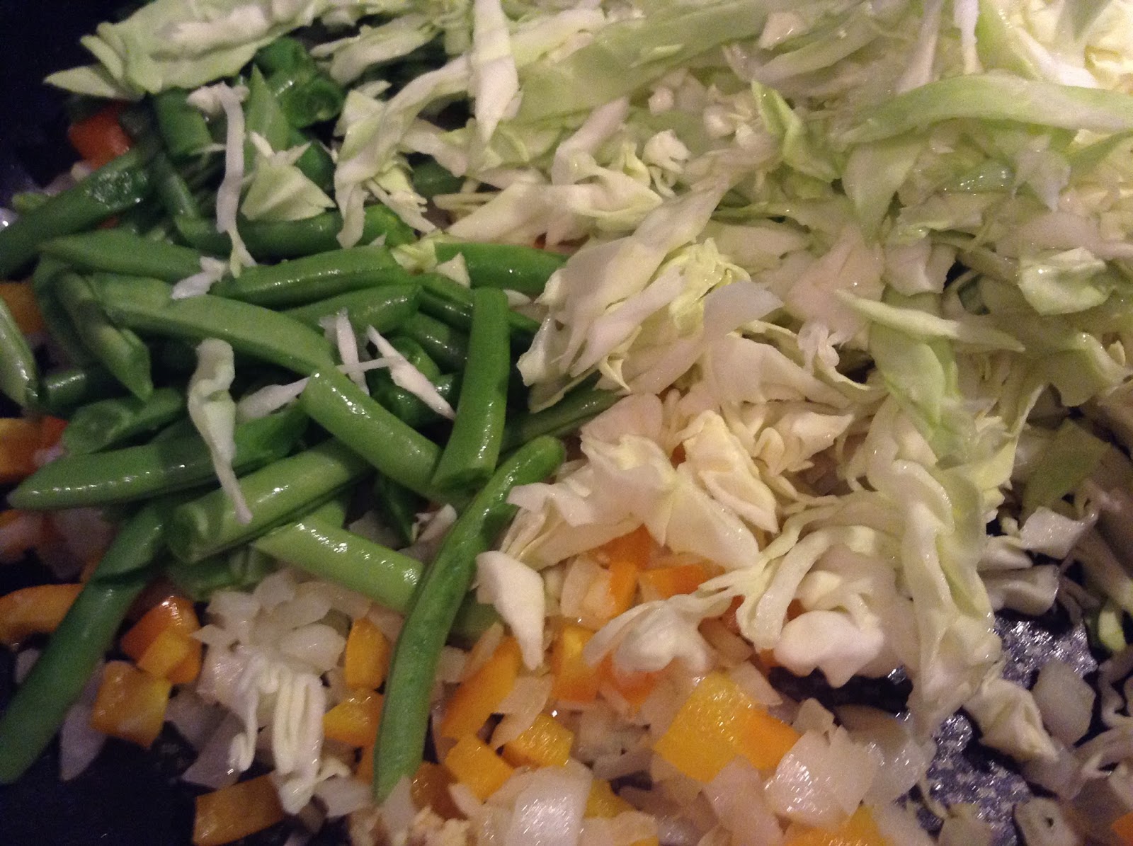 Agreguen los ejotes, repollo y sigan cocinando un poco mas, añadan la coliflor, salsa soya, sal y pimienta